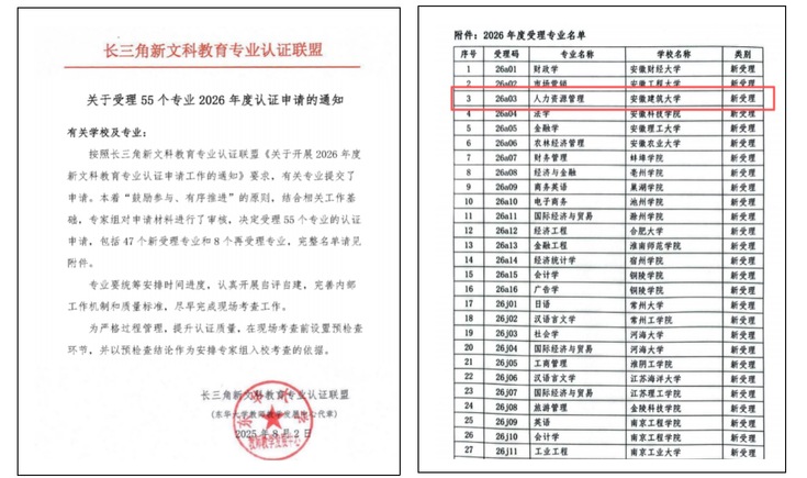近日,长三角新文科教育专业认证联盟发布《关于受理55个专业2026年度认证申请的通知》,经联盟严格审核,公管学院人力资源管理专业代表安徽建筑大学文科专业成功入选,标志着我校在新文科建设征程上迈出重要一步。该联盟于8月25日召开2026年度受理专业骨干教师培训会,人社系教师党支部书记连瑞瑞与人力资源管理专业7位教师参加。
