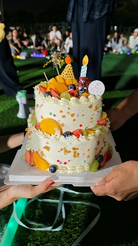 晚会最后学院还设置了暖心互动环节,为七名2025级新生筹备了“集体生日会”,当生日歌响起、蛋糕推上台时,全场学子共同送上祝福,新生们互相分享初入校园的喜悦与感受,就未来大学阶段的学习规划、成长目标畅谈心里话。在场师生一起点燃生日蜡烛,齐声唱响《生日快乐》歌,共享生日蛋糕,共度美好时光。