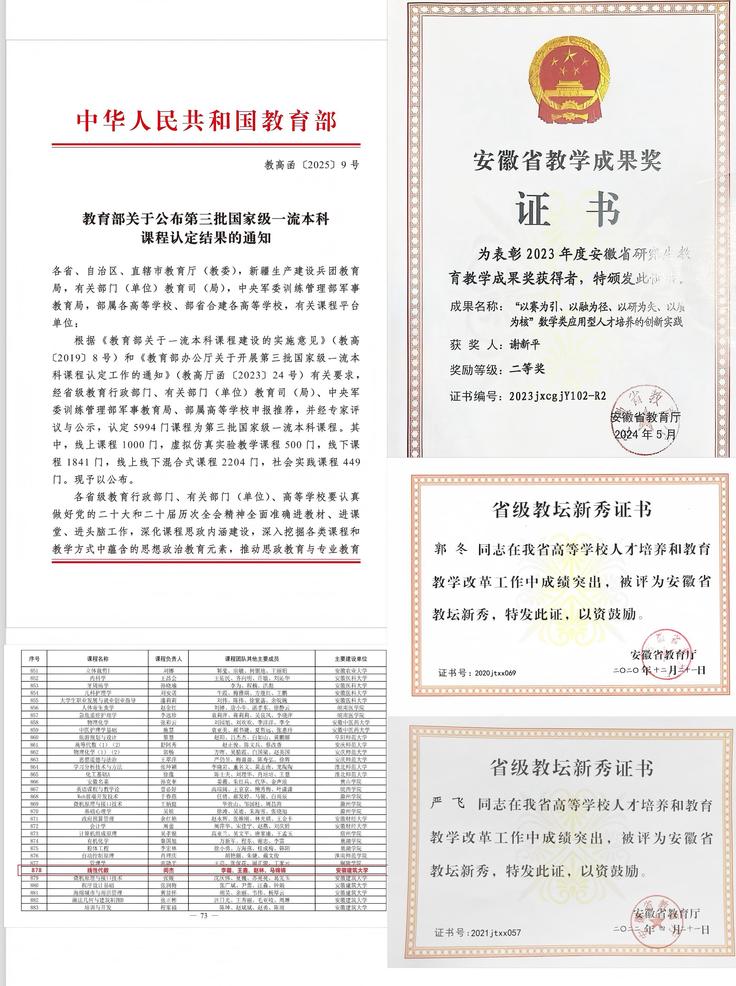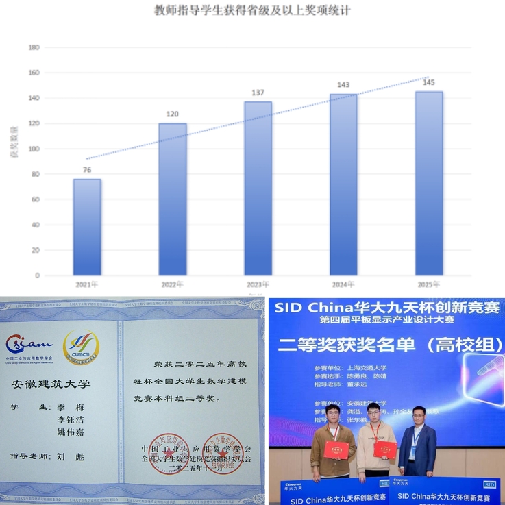 这五年,学院坚守教学中心地位,以一流课程和专业建设服务全校人才培养“大棋盘”。基础教学“强支撑”,聚焦全校11个学院基础教学,构建“厚基础、重应用、强能力”课程体系,建成省级一流课程3门、校级5门,主编教材1部,获省级教学成果奖2项。2025年,《线性代数》获批国家一流本科课程,实现零的突破。课程组通过常态化集体备课与专题教学研讨,结合全校性期中考试的学情分析,精准把握教学方向,为人才培养筑牢数理基础。专业建设“有突破”,敏锐把握大数据时代机遇,2021年成功申报数据计算及应用专业并于次年9月迎来首届新生;2023年复招信息与计算科学专业,以“新增+复办”双路径优化人才培养结构,完善学科专业布局。教学创新“结硕果”,五年来,学院教师主持省级及以上课程改革与精品课程建设项目30余项,获批省级教学团队3个。教师以赛促教,教学水平持续提升,斩获多项殊荣:李璐获安徽省高校大学数学课程教学创新比赛特等奖、第二届全国高校教师教学创新大赛地方高校副高组二等奖;姚丹、仕敏分获安徽省高校青年教师教学竞赛一、三等奖;张学勇教授获评“安徽省教学名师”,严飞、郭冬、仕敏荣获“安徽省教坛新秀”称号。竞赛育人“显成效”,学院以“赛学相长、以赛促学”为理念,创新实施“数学建模进课堂”工程,将国家级竞赛内容有机融入《高等数学》《大学物理》等核心课程。学生竞赛获奖数量从2021年的76项逐年攀升至2025年的145项。“十四五”收官之际,数理师生更是先后斩获第五届ICDT新型显示技术竞赛优胜奖、第四届 “华大九天杯” 创新竞赛二等奖,在全国大学生数学建模竞赛中的获奖质量与数量同时实现了历史性突破。竞赛已成为检验教学质量、激发学生创新潜能的重要引擎。