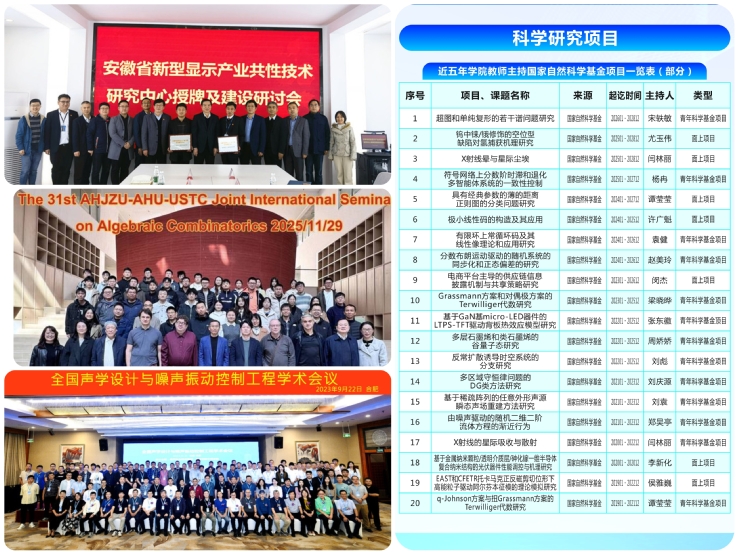 这五年,学院坚持科教融汇,将前沿探索与国家需求、地方发展紧密结合,引导学生在攀登科学高峰中成长成才。平台建设“筑高地”,学院拥有安徽省建筑声环境重点实验室、先进电子材料与器件重点实验室两大省级科研平台。2022年,安徽省新型显示产业共性技术研究中心落户学院,聚焦新一代显示技术与材料的关键核心技术攻关。科研攻关“结硬果”,“十四五”期间,学院共获批国家自然科学基金项目14项、省部级基金项目47项;获批人才项目10项,其中韩娟老师入选国家级重点引才计划。学院教师在SCI收录期刊发表论文251篇,且年均均有论文入选ESI高被引,科研产出质量稳步提升。产学研用“深融合”,学院瞄准国防军工、声学工程、新型显示等领域,签订产学研合作合同22项,总经费超300万元,切实将论文写在服务经济社会发展的大地上。学术交流“阔视野”,学院承办了全国环境声学学术研讨会、中国运筹学会随机服务与运作管理分会学术年会等高水平会议,并邀请海内外知名学者举办学术报告47场,为学生开启了通往科学前沿的窗口。在导师带领下,本科生直接参与科研项目的比例显著提升,一批优秀学子在“挑战杯”、“互联网+”等创新创业大赛中脱颖而出,实现了科研实践反哺创新人才培养的良性循环。