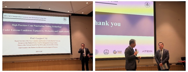 蔡国军教授应邀作大会专题主旨报告,报告题目为“Engineering Application of High-Precision Static Cone Penetration Testing Technology under Extreme Conditions”。蔡国军教授系统阐述了极端条件下静力触探的贯入理论与技术体系,重点介绍了高精度静力触探装备的研发进展,以及复杂环境下数据智能解译方法与工程可靠度评价技术。报告围绕极端气候与灾害作用下沿海地区软弱地基勘察、基础安全评估与工程减灾等关键问题展开,展示了团队在相关领域的最新研究成果与工程实践案例。