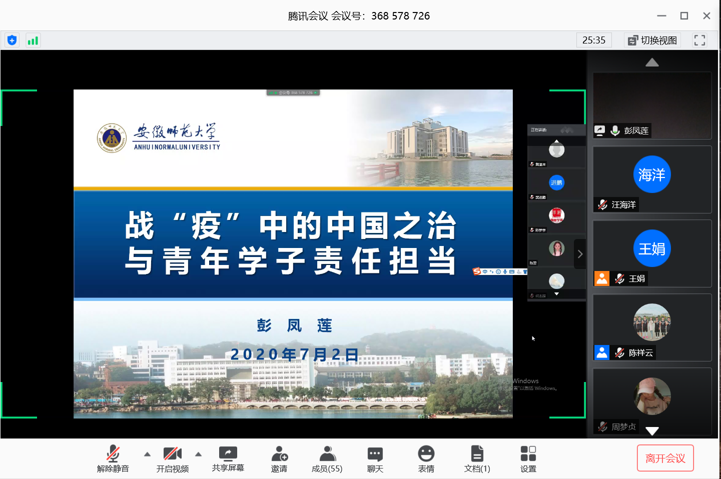 本网讯(地旅学院 陈祥云)7月2日,副校长彭凤莲走进“云端”课堂,在腾讯会议平台为我院2018级旅游管理专业本科生线上讲授题为《战“疫”中的中国之治与青年学子责任担当》的专题形势与政策课。