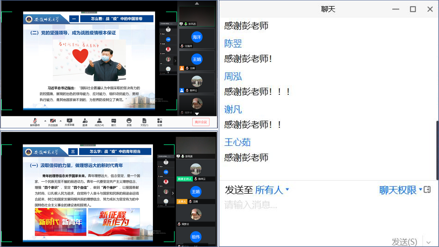 形势与政策课上,彭凤莲围绕战“疫”中的中国答卷、战“疫”中的中国精神以及战“疫”中的中国青年担当等三个方面论述了战“疫”中的中国之治与青年学子责任担当。彭凤莲从疫情突如其来,民族复兴面临严峻挑战的背景,讲到党的坚强领导成为战胜疫情的根本保证,并在抗“疫”中的国际比较中,论证大国之治彰显制度优势。她还指出,战“疫”中的中国精神是履职尽责,冲锋在前的奉献精神;众志成城,同舟共济的团结精神;自强不息,越挫越勇的奋斗精神;守望相助,命运与共的担当精神。青年学子应在战“疫”中汲取信仰的力量、担当的力量、科学的力量、法治的力量,做理想远大、励志奋斗、求真务实、遵纪守法的新时代青年。