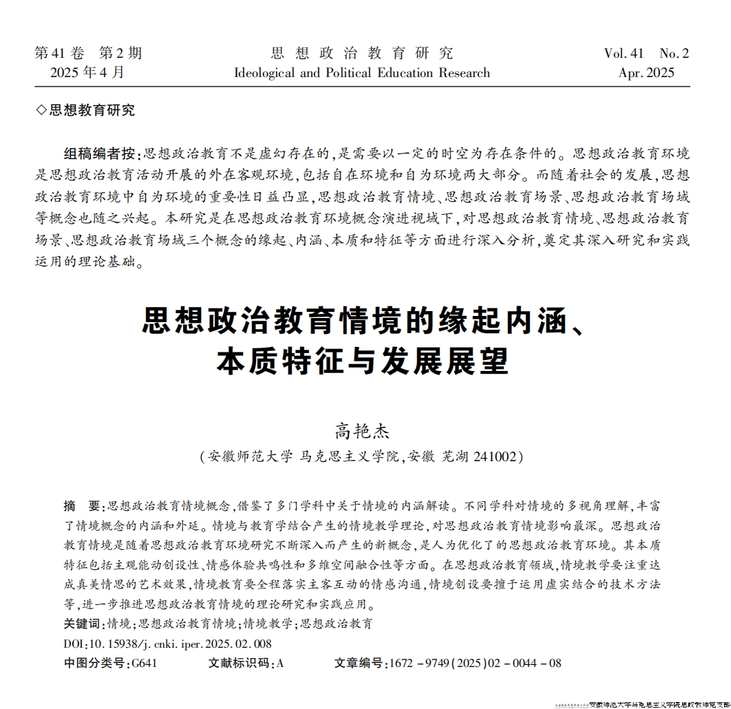 思政教师党支部青年教师高艳杰于《思想政治教育研究》2025年第3期刊发题为《思想政治教育情境的缘起内涵、本质特征与发展展望》高水平学术文章。文章聚焦思想政治教育情境概念,借鉴了多门学科中关于情境的内涵解读,全面且深刻的揭示了思想政治教育情境的科学内涵。本文是支部聚焦思想政治教育基础理论研究重地的又一代表性成果。显示了支部凝练研究方向,以科研赋能强国力行的积极成果。
