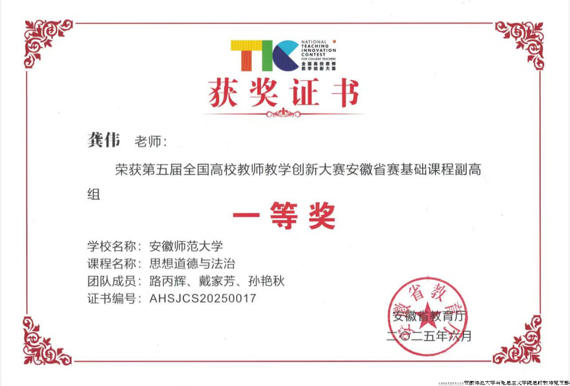 近日,思政教师党支部青年教师龚伟副教授荣获第五届高效教师教学创新大赛安徽省赛基础课程副高组一等奖。据悉,思政教师党支部秉持党建引领事业发展的理念,将备赛准备全程融入主题党日活动,专题就创新报告、教学设计、模拟比赛等环节进行集体学习研讨。该项教学比赛佳绩的获得,既体现了样板支部建设的积极成效,也彰显了支部投身强国行的具体举措。