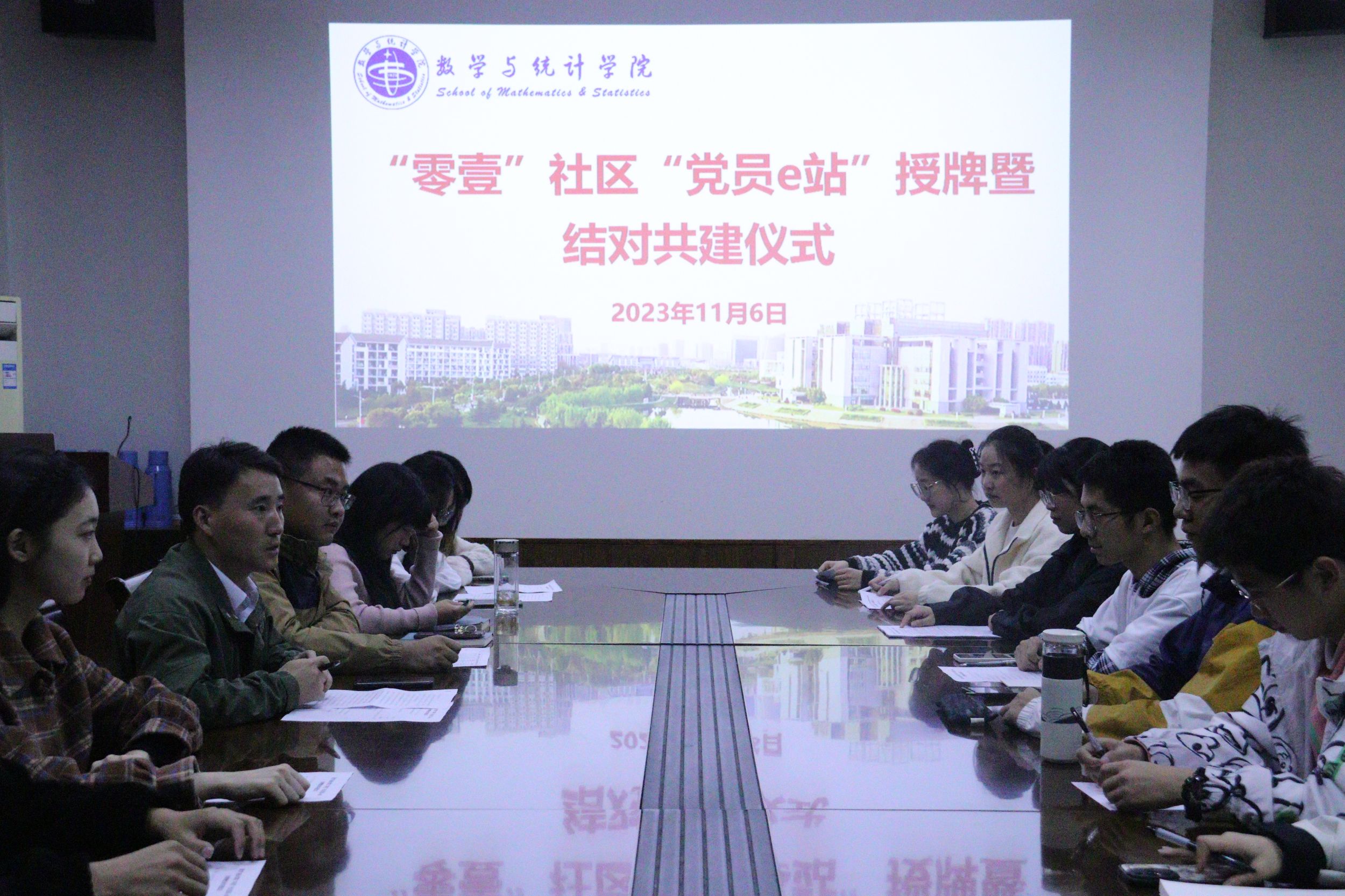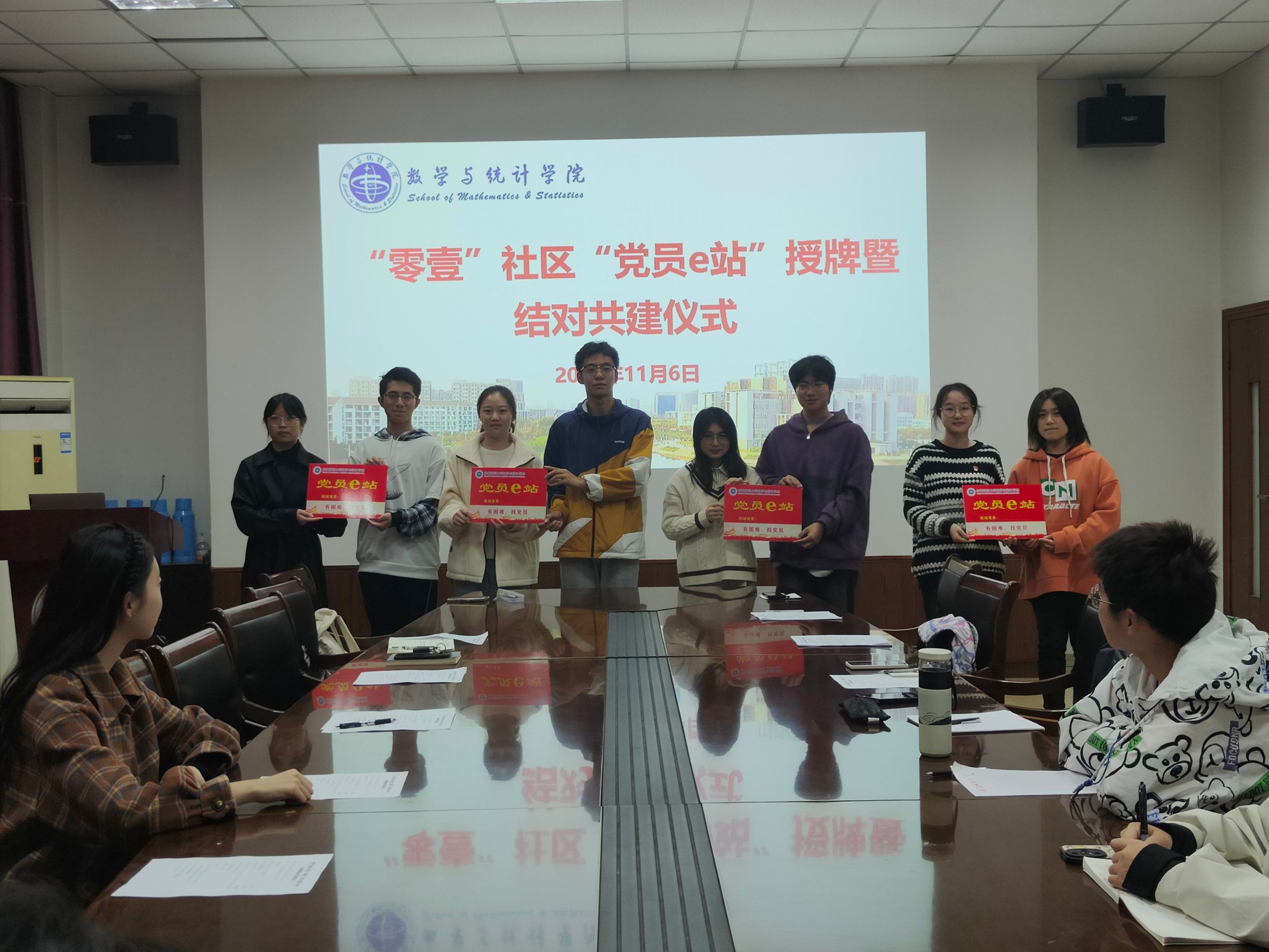 为深入学习贯彻习近平新时代中国特色社会主义思想和党的二十大精神,充分发挥基层党组织在学生教育管理工作中的党建引领作用,加快推进学院“一站式”学生社区建设工作,11月6日晚7时,数学与统计学院在天门山校区第一会议室举行“零壹”社区“党员e站”挂牌仪式暨结对共建仪式,数学与应用数学专业本科生第二党支部书记毕昌喜、辅导员潘楠楠、部分学生党员代表、新生代表共同参加此次仪式,会议由学院团委副书记朱荣祥主持。
