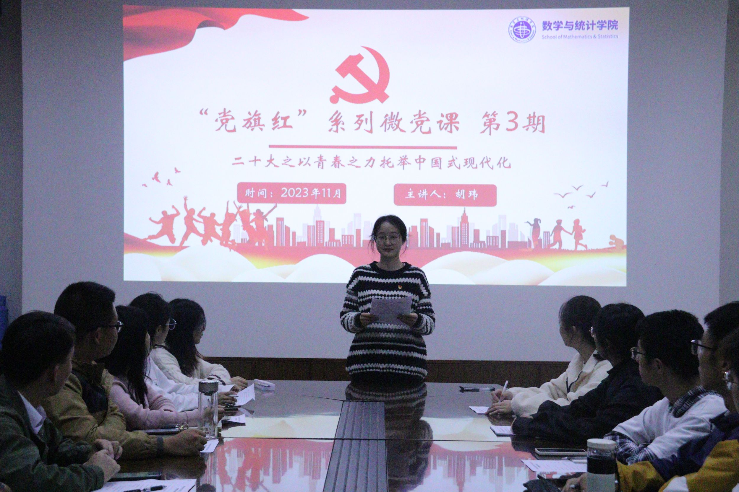 钱丽娜作为党员代表发言。她表示作为学生党员,将进一步提高政治站位,充分发挥先锋模范作用,精准对接学生需求,努力实现同学们的需求有回应、有保障、有落实,竭尽全力引领青年学子健康成长。共建仪式结束后,数学与应用数学专业本科生第二党支部党员胡玮开展党的二十大精神宣讲,她在党课中阐释了“什么是中国式现代化”“为什么走中国式现代化治之路”“如何以青春之力助力中国式现代化”三个问题。她强调青年学子要始终铭记初心使命,在实践中努力成长为堪当民族复兴重任的时代新人,以实干投入中国式现代化的历史洪流中。
