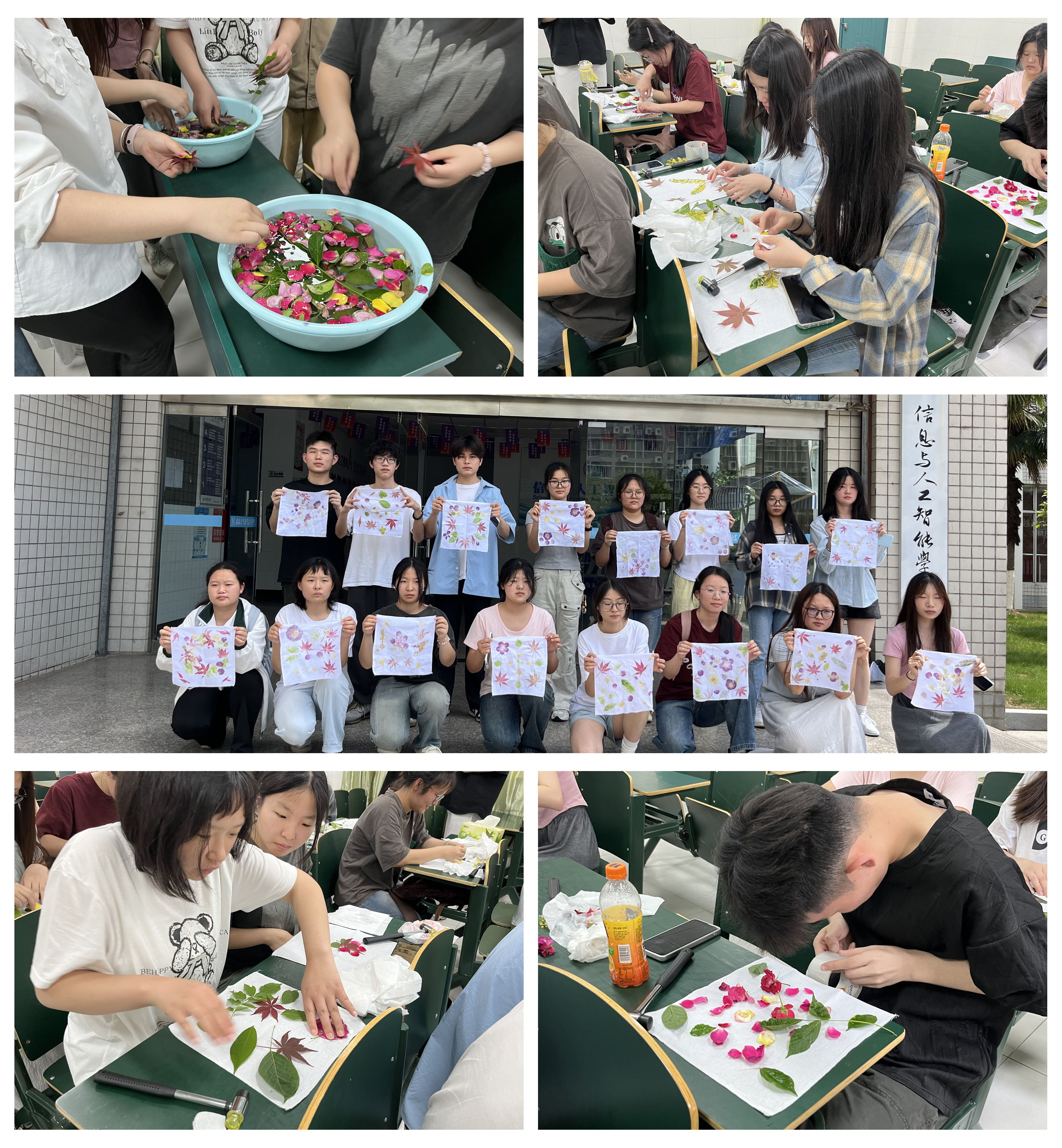 5月14日,信息与人工智能学院学生会生活部组织开展了“与自然对话·植物拓染”心理健康实践活动,各班级同学积极参与,在自然艺术创作中体验心灵疗愈。活动伊始,生活部成员首先为同学们讲解了植物拓染的历史渊源和制作技巧。在轻松的氛围中,同学们精心挑选新鲜的花草叶片,通过捶打、拓印等工序,将植物的自然纹理永久定格在方巾上。人工智能232班的王同学兴奋地说:“看着花瓣的脉络慢慢显现在布料上,整个过程特别解压,心情也变得平静愉悦。”
