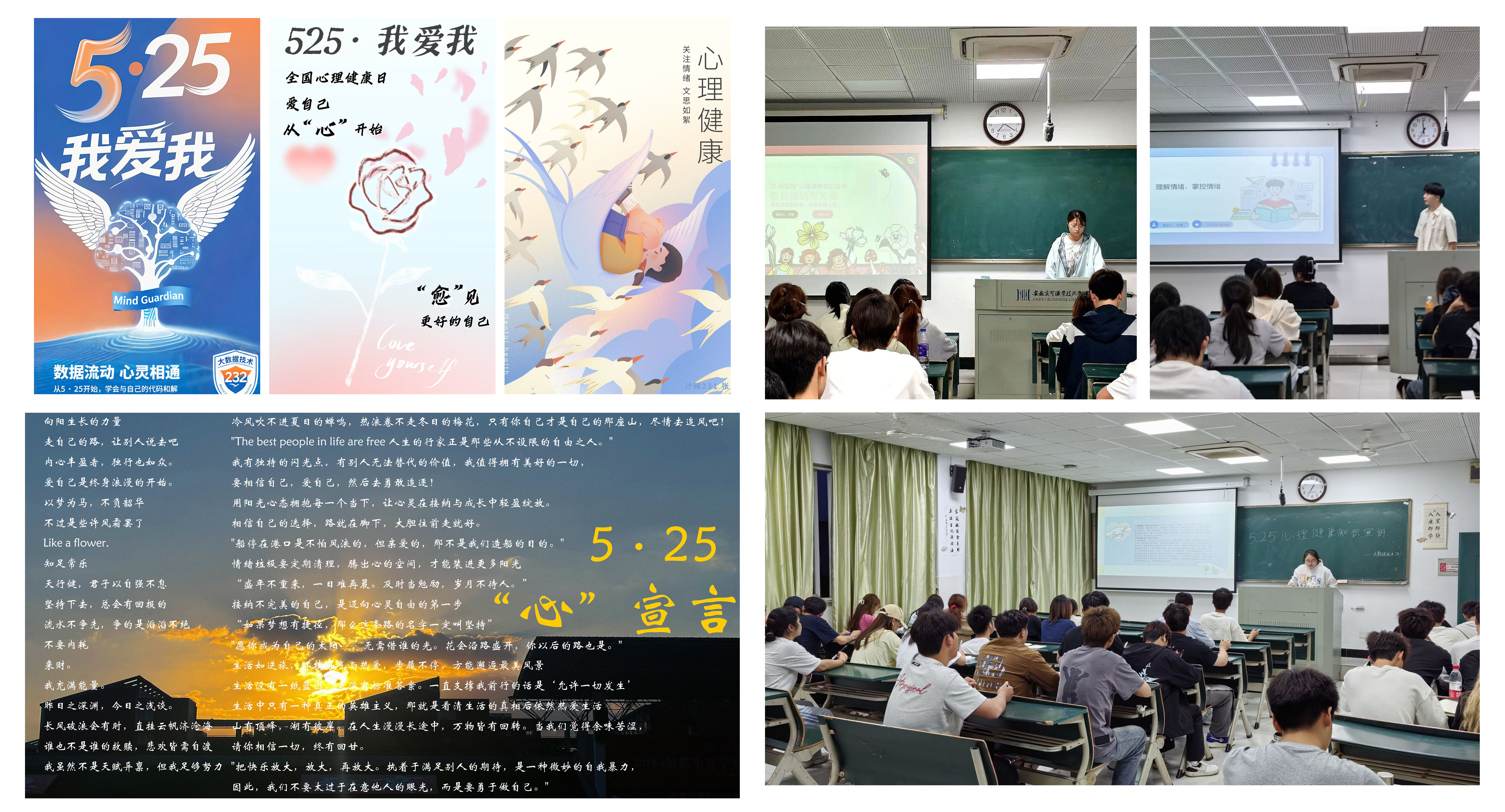 为更好地普及心理健康知识,学院组织各班级开展了多形式的宣传活动。 5·25“朋辈同行,从心启航”心理健康知识宣讲活动,充分发挥朋辈教育在心理健康工作中的独特作用;5·25“我爱我”心理健康知识海报设计活动,围绕“我爱我”三个字进行艺术字体创意大赛,围绕主题“心理健康日”设计宣传海报;5·25“心”宣言——心理健康宣言征集,通过简洁有力的语言,传递温暖与力量,鼓励同学们关注自身心理状态,勇敢面对挑战,追求内心的平衡与幸福;5·25班级心理健康创意活动“我爱我·心成长”——关注心理健康,激发创意表达:人工智能技术应用232“以故事换花”,计算机网络技术242、电信241“我爱我,新成长”励志语录收集,物联网应用技术241班“微笑接力”,师生用各具特色的活动营造了积极向上的班级心理文化氛围。