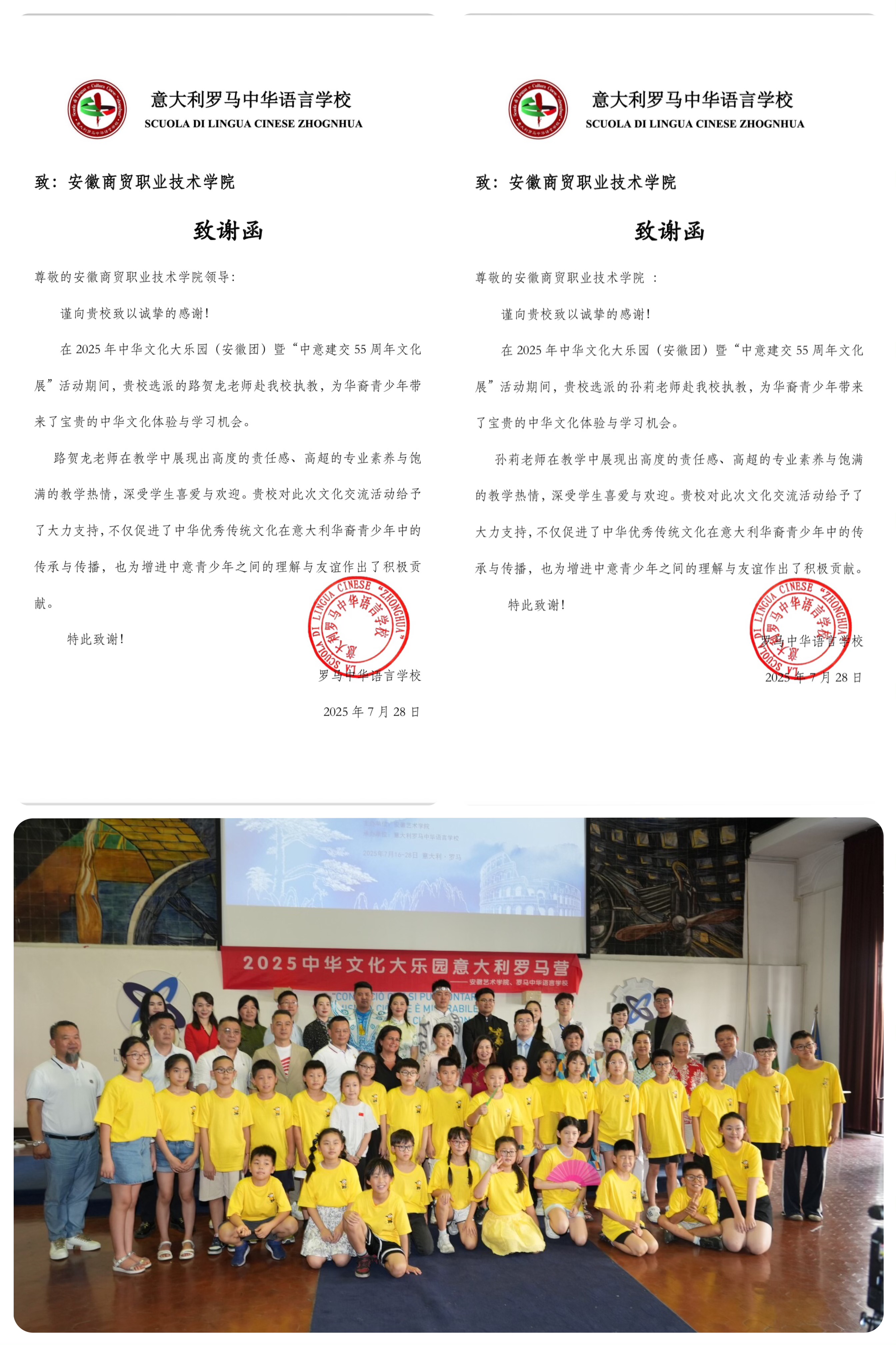 7月16日至28日,由安徽省委统战部主办的“2025年中华文化大乐园——罗马营”在意大利罗马中华语言学校举办。学校孙莉和路贺龙两位教师凭借出色表现,为传播中华文化贡献了力量,赢得广泛赞誉,为此,意大利罗马中华语言学校向我校发来致谢函。