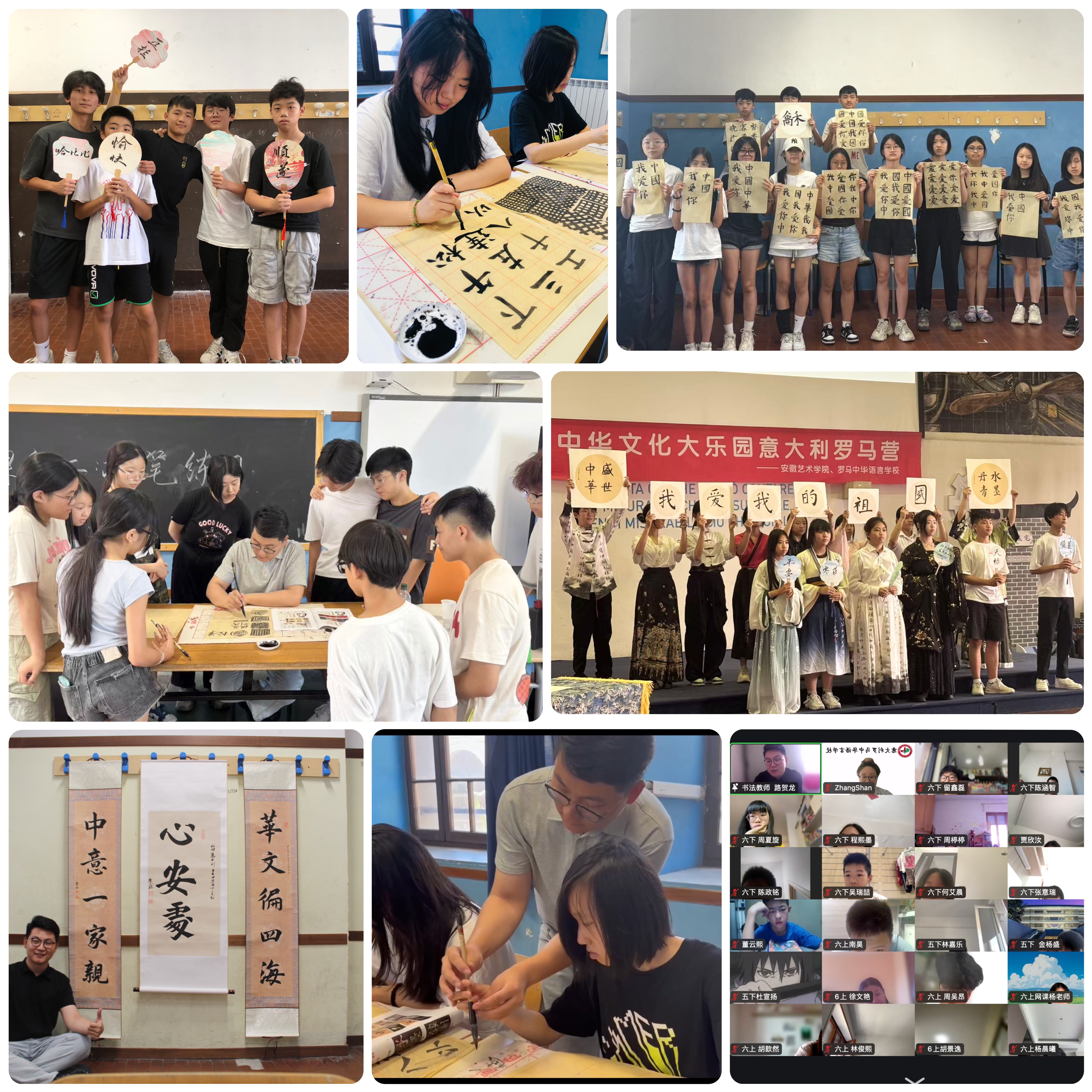 路贺龙老师的书法课堂则是一片墨香四溢的天地。他充分发挥自己的专业优势,结合学生的实际情况,制定了有针对性的教学计划。通过网络硬笔课程,利用现代信息技术,结合课本同步字词为学生提供了便捷有效的学习渠道。在线下软笔书法课程中,他从汉字的起源讲起,深入浅出地介绍了中国书法的发展历程和各种字体的特点、体验非遗漆扇、书写爱国诗篇等。在教学过程中,他注重基本笔画的示范与指导,耐心纠正学生们的书写姿势和笔画顺序。看着学生们从握笔不稳到写出工整美观的汉字,路贺龙老师脸上洋溢着欣慰的笑容。他还带领学生们欣赏了许多中国书法名家的作品,让他们感受书法艺术的独特魅力。为了让学生们更好地理解书法与中国文化的关系,闭营仪式上学生们书写展示的“盛世中华”“我爱我的祖国”等内容在现场引起海外游子的强烈共鸣。