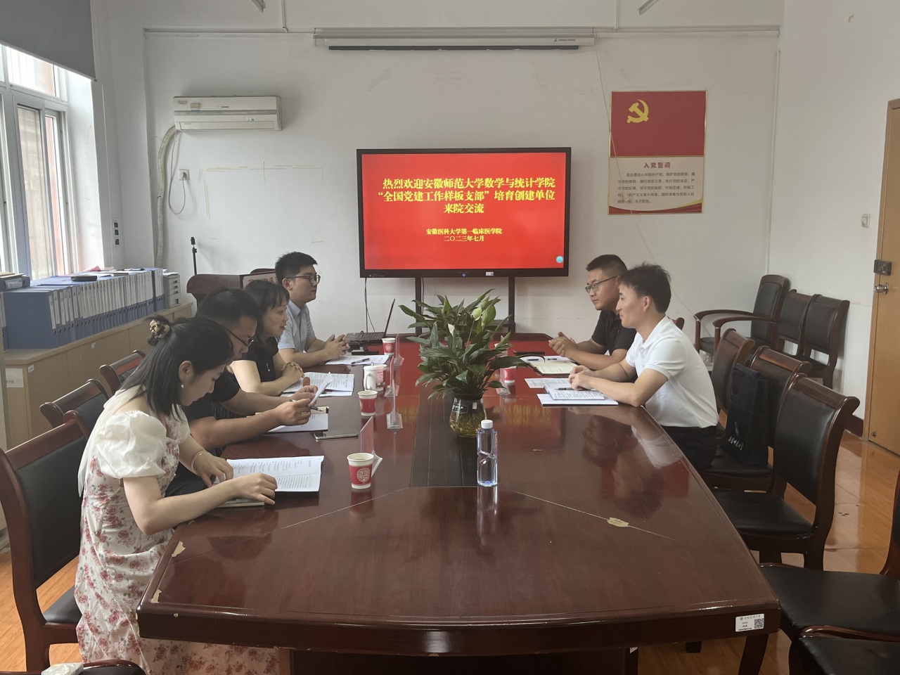 7月6日上午,教育部第三批“全国党建工作样板支部”培育创建单位、安徽师范大学数学与统计学院数学与应用数学专业本科生第二党支部负责人到第一临床医学院交流样板支部培育创建工作,该院学生党总支副书记沈慧出席工作交流会,教育部第三批“全国党建工作样板支部”培育创建单位、该院学生党总支第二党支部负责人主持会议。