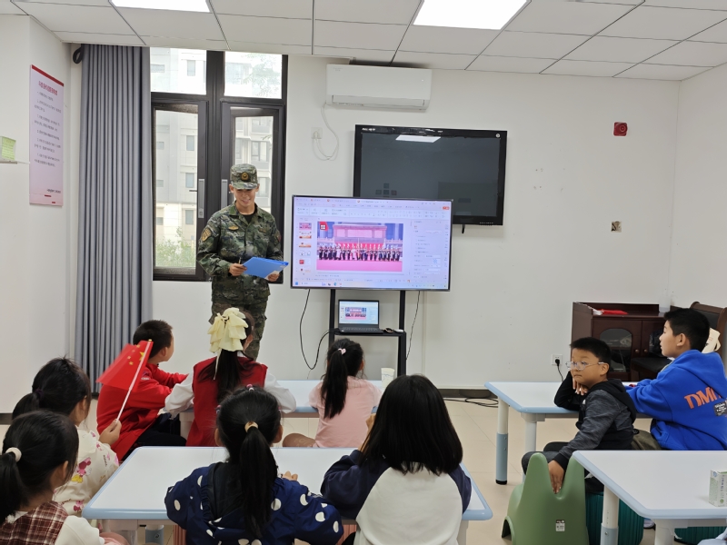 活动以“什么是国防”为切入点,由退伍军人电子2521班的张政担任主讲,通过图文结合的方式,系统讲解国防的基本概念、战略意义等,同时耐心解答孩子们关于“国防如何保护我们”“军人日常训练内容”等疑问,帮助青少年建立对国防的基础认知。在“国防发展大事记”环节,志愿者带领孩子们沿着历史脉络,回顾我国国防建设从无到有、从弱到强的关键节点——从开国大典的装备简陋,到如今航母列装、战机翱翔的辉煌成就。一张张珍贵的历史图片、一段段振奋人心的发展故事,让孩子们深刻体会到国防建设的艰辛与不易,民族自豪感与家国责任感油然而生。