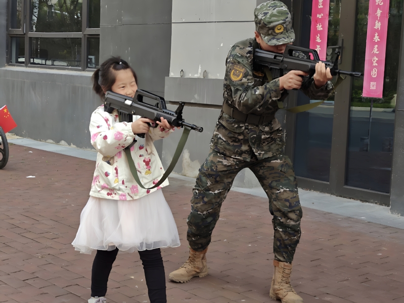 最受孩子们期待的枪械知识普及与实践环节,将活动氛围推向高潮。志愿者展示各类枪械模型,详细拆解枪械结构,讲解使用原理与安全守则;在确保安全的前提下,组织孩子们分组进行模型枪操作练习,并手把手指导模拟射击——“瞄准要做到三点一线,扣扳机时手要稳”,专业的教学让孩子们快速掌握射击要领。亲身参与的体验,不仅让孩子们学到了枪械知识,更直观感受到军人训练的严谨与艰辛,进一步加深了对国防工作的理解。