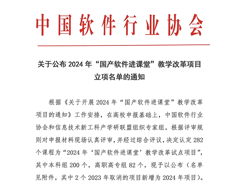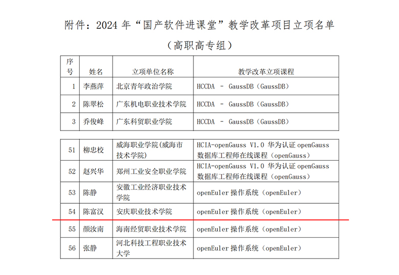 “国产软件进课堂”教学改革项目,旨在贯彻执行党中央、国务院关于深化现代职业教育体系建设改革的指导方针,加速专业结构的调整与优化,促进高等教育的高质量发展,推动国产自主软件技术在教育领域的应用。2024年度该项目由中国软行业协会、信息技术新工科产学研联盟与华为技术有限公司共同开展,经过严格筛选,全国高职院校共有82个项目获得立项,其中本省高职院校仅有3个项目入选,本次申报的openEuler操作系统方向全国共立项13项。