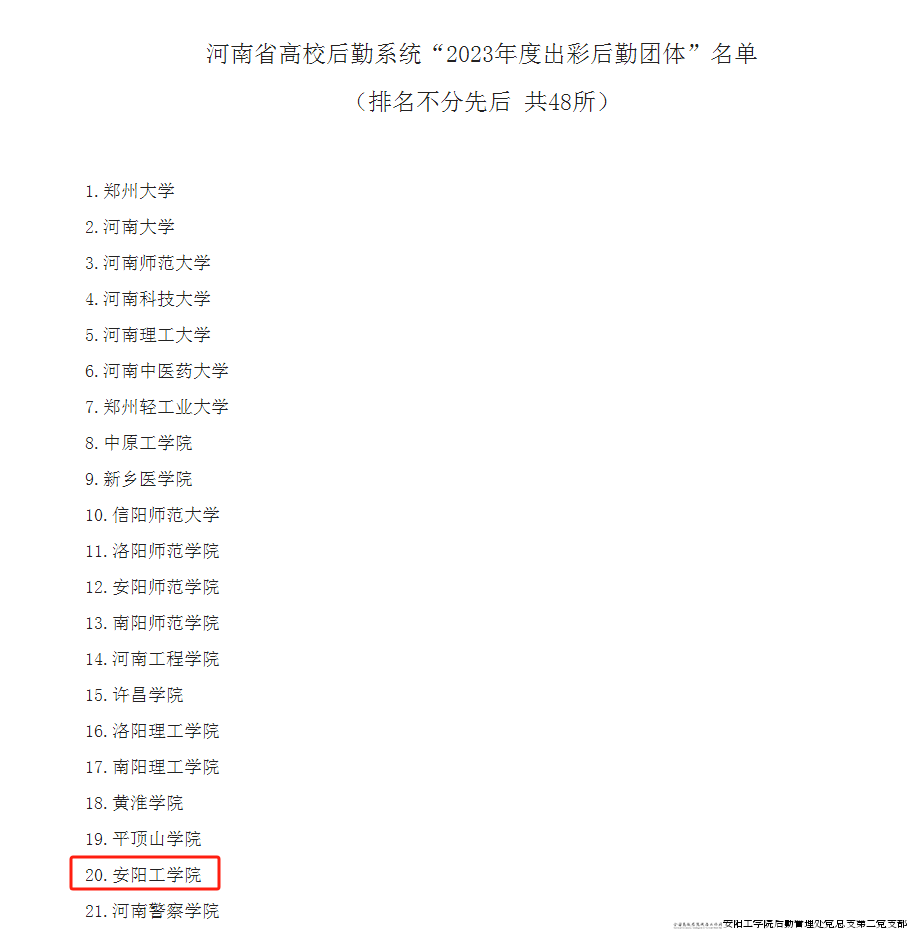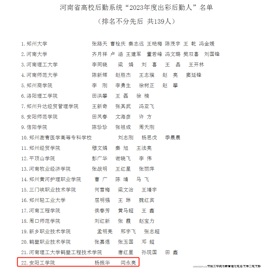 后勤管理处荣获河南省高校后勤系统“2023年度出彩后勤团体”荣誉称号;杨振华、闫永亮荣获河南省高校后勤系统“2023年出彩后勤人”荣誉称号。后勤管理处处长侯永强荣获“河南省教育后勤协会2023年度节能管理先进个人” 荣誉称号。