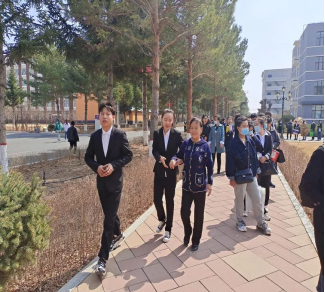 (廉秀清同学在志愿者陪同下参观校内风景)