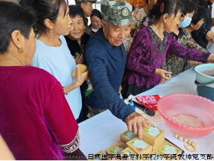 药学科普文艺演出率先开场,志愿者们用生动表演将复杂中医药知识通俗化,让村民在欢笑中领略传统医学魅力。中药驱蚊香包制作体验环节人气爆棚,村民在专业指导下亲手调配中药材、制作香包,引得村民称赞。非遗扎染和漆扇体验区同样精彩,村民沉浸其中,感受传统工艺与中药材结合的艺术,制作出精美作品。“用药安全、药品回收”环节中,党支部成员通过现场讲解、普及安全用药知识,纠正用药误区,倡导回收过期药品,村民表示宣传实用,弥补了用药知识空白。随后,志愿者们为村民发放粽子、药皂、香包等端午节礼物,将祝福送到大家手中。