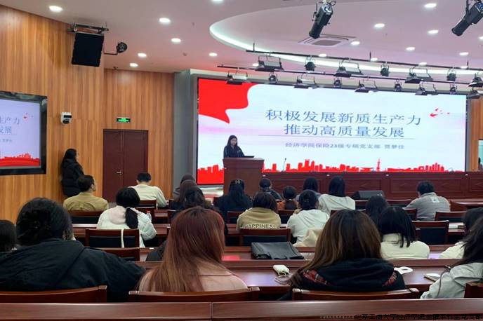 保险23级专硕党支部书记贾梦佳聚焦两会热点“新质发展力”一词,对该词汇进行解读并从三个角度讨论如何作用于社会发展,以《积极发展新质生产力、推动高质量发展》为主题进行专题汇报。首先以图文结合的方式向大家生动地解读了新质生产力的定义、产生及基本内涵,详细说明了新质生产力高科技、高效能和高质量的新特征,可以有效推动全要素生产率的提高。随后从企业和数字经济两个角度谈发展新质生产力,新质生产力的发展要以“促就业”作为一切工作的前提条件,并以货拉拉“智慧大脑”为例讨论了通过网络技术、智能算法加以赋能解决数智化问题。最后,结合自身专业所学,介绍了今年保险业的发展重点将围绕加强老年人保险保障和服务新质生产力展开,以推动战略性新兴产业集群发展,强化全球竞争力,为培育形成新质生产力夯实根基。