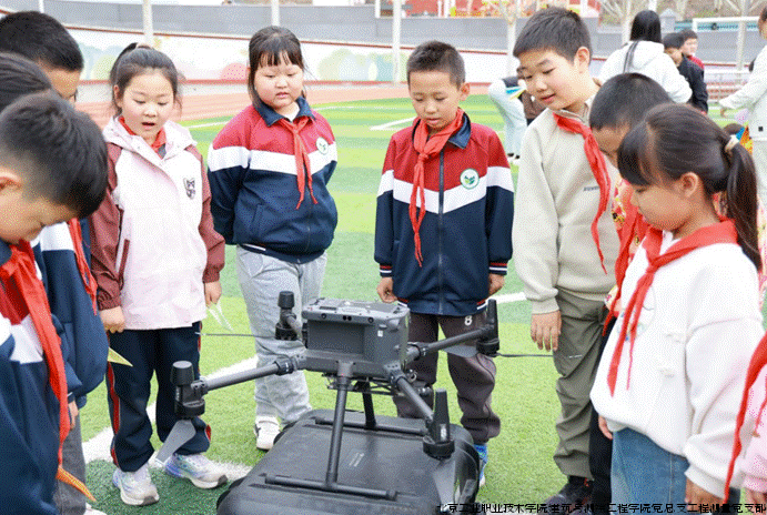 随后,师生们移步操场进行实践体验。专业学生为孩子们进行了多旋翼无人机飞行演示,包括航拍、定点悬停等高难度动作,并指导学生参与辅助飞行,操场上欢呼声此起彼伏。