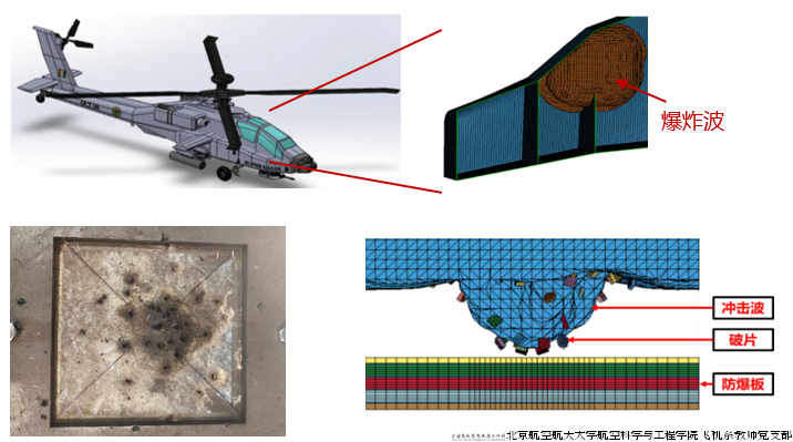 在挂职期间,李明净同志面向直升机应用防护需求,参与了结构部某型号直升机驾驶舱结构的抗爆性能指标论证和防护结构研制技术攻关。首先调研了过去数十年间美军在直升机战场防护方面发布的军用标准、手册和相关技术资料,梳理了美军自上世纪七十年代提出战场生存力概念以来在直升机防护设计方面的技术发展脉络,总结了当前美军在直升机结构防护(尤其时抗爆防护)方面的设计要求、技术现状与测试评估方法,为某型号直升机驾驶舱结构抗爆性能指标论证提供了依据。然后,充分发挥北航研究团队在抗冲击防护方面的基础理论和分析技术优势,采用理论和仿真方法分析了该驾驶舱的内外不同位置遭受高爆弹打击时的结构响应和毁伤过程,确定了驾驶舱内最危险的受打击位置和最关键的防护部位,为精细化的关键部位防护结构设计提供支撑。最后,结合结构部的工程设计经验优势和北航团队的分析计算理论优势,开展了联合技术攻关,根据防护指标要求开展了驾驶舱关键防护部位的抗爆结构设计,突破了抗爆毁伤分析评估和结构设计等方面的关键技术,为直升机防护结构设计提供了支撑。
