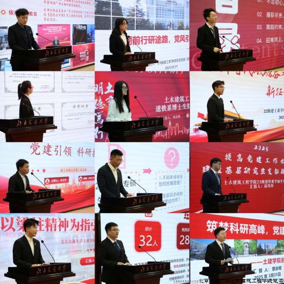 表彰会以“红色旗帜 筑梦韶华”视频为开篇,简要回顾了2024-2025学年土建学院研究生党建工作取得的成效。随后,12个入围五星级终评的党支部书记结合本支部的实际情况和特点,分别从“向外求索,向内求实”“1+5党建工作法”“梁柱精神”“问题导向,实事求是”“党建引领研讲践三结合”“践行爱路报国”“三创三树”“创树红色品牌”等特色工作法出发,由点及面地介绍了党支部的年度工作和特色品牌。