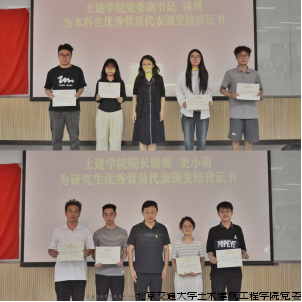 土建学院党委副书记陈博、院长助理史小萌为第五届“思源”学生党员骨干训练营优秀营员代表颁发结营证书。