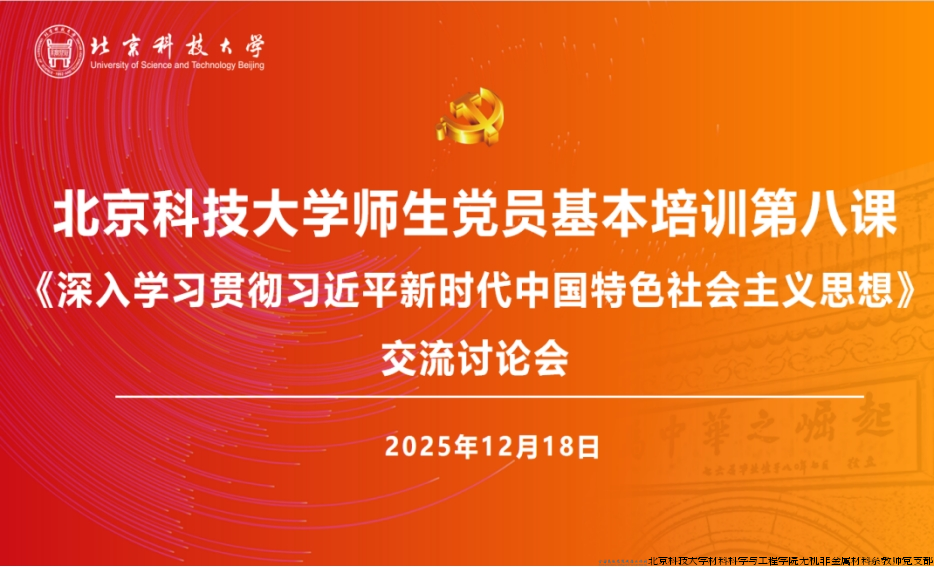 2025年12月18日下午,北京科技大学举办全体党员基本培训第八课,中央党校(国家行政学院)科研部主任陈曙光教授围绕“深入学习贯彻习近平新时代中国特色社会主义思想”主题作专题培训报告。培训结束后,无机非金属材料系教师党支部第一时间组织党员教师开展集中研讨,党员同志们紧密结合材料学科特色与一线教学科研实际,踊跃交流培训心得,展开深入讨论。