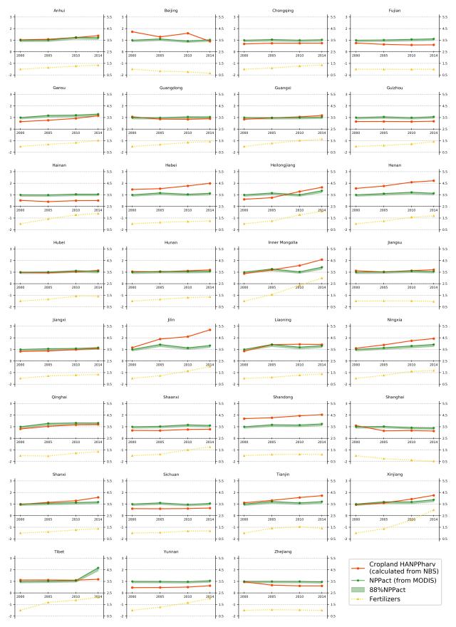 对中国这样一个14亿多人的发展中大国,粮食的产量是否能满足人民的消费一直是一个存在争议的问题。已有研究通常利用耕地面积的变化趋势、农村劳动人口的变化趋势、产量与消费数据的对比、对进口农产品的依赖程度变化等方法来核对中国粮食产量可能并不是像统计年鉴里记录的那样几乎连年增长。但这些方法同样依赖官方的统计数据,而当前自下而上的统计方法仍存在难以破解的难处,可能存在同样的数据问题。本研究首次提出日益精进的遥感监测数据将成为检验农产品产量统计数据合理性的相对客观的手段。另外,本文还利用中国各地的农作物参数对传统的HANPP研究中所利用的参数进行了校正,并提出各省市的校准系数,以获取更有实际参考意义的数据,经过敏感性分析,计算结果对部分参数较为敏感,这也说明了HANPP作为一个大尺度的研究方法,在降尺度研究时要特别注意数据的选择。各种方法的相互校验能够推动相关理论研究、实验方法、遥感手段、统计方法、监督机制等的共同发展。
