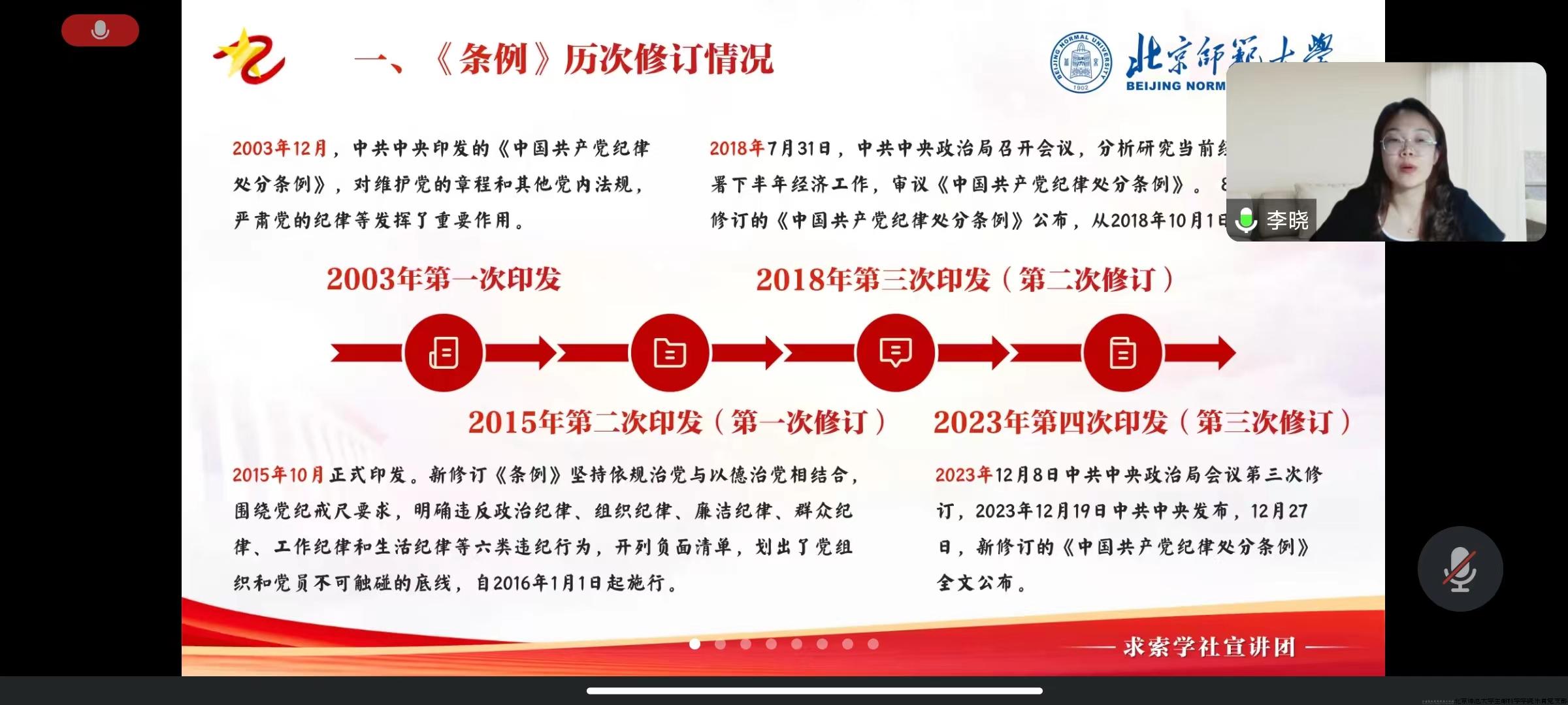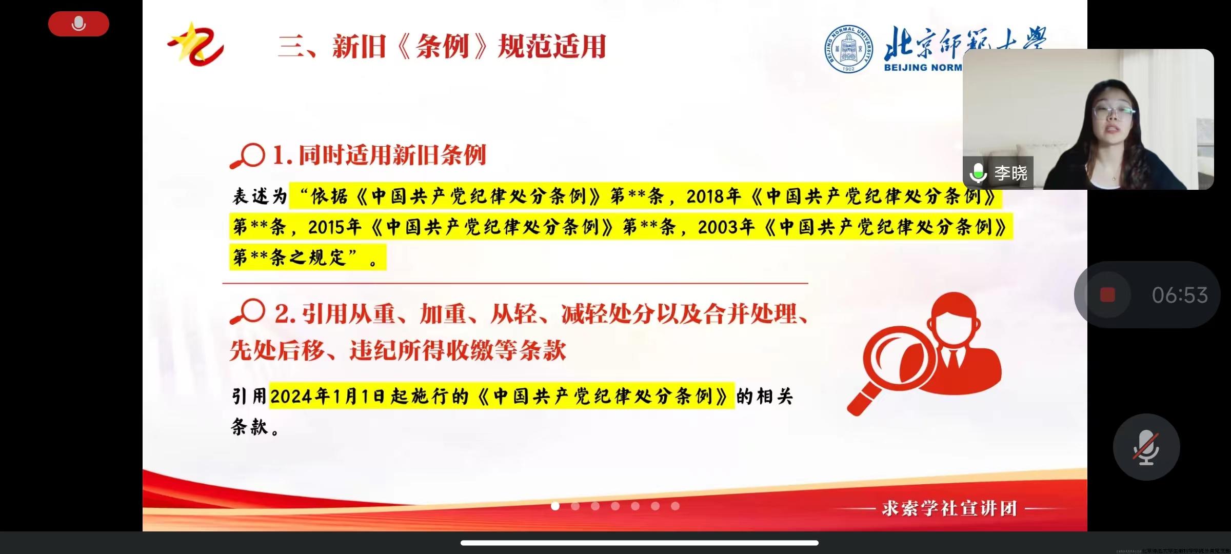 为深入学习贯彻习近平总书记关于党纪学习教育重要讲话和重要指示精神,加强支部党纪建设,树立支部良好党纪风尚,2024年5月21日晚20:00,教育学部2023级硕士研究生第九党支部与生命科学学院乐育党支部,共同邀请了求索学社宣讲团的李晓同志,进行以《〈中国共产党纪律处分条例〉修订情况、主要内容与规范适用》为主题的宣讲活动,并邀请教育学部2023级硕士研究生第九党支部书记李赓欣进行了以《刀刃向内:党史上的纪律建设》为主题的支书讲党课活动。活动由生命科学学院乐育党支部书记王纪阳主持,六十余名同学通过腾讯会议在线参会。
