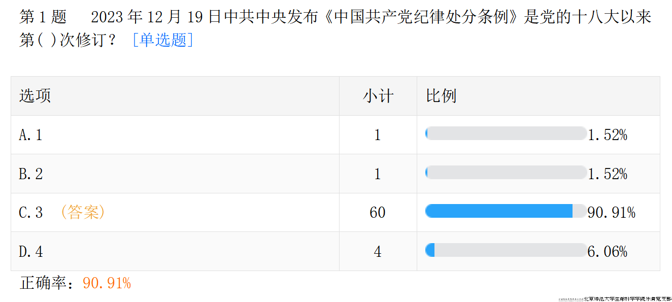 活动的最后,各支部成员完成了《条例》知识问卷,对今日《党纪条例》学习成果进行检验和复习,增强了支部成员对党章党纪的认识和理解,部分问题及作答结果见下图。