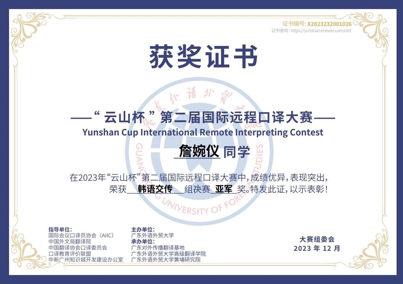 2023年12月17日,第二届“云山杯”国际远程口译大赛总决赛在广东外语外贸大学成功落幕。其中,我校亚洲学院朝鲜语专业口译方向硕士研究生詹婉仪同学在本次大赛中发挥出色,成功进入韩语交传组决赛,并最终夺得亚军的好成绩。詹婉仪同学的指导教师李丽秋教授也被评为本次大赛的优秀指导教师。