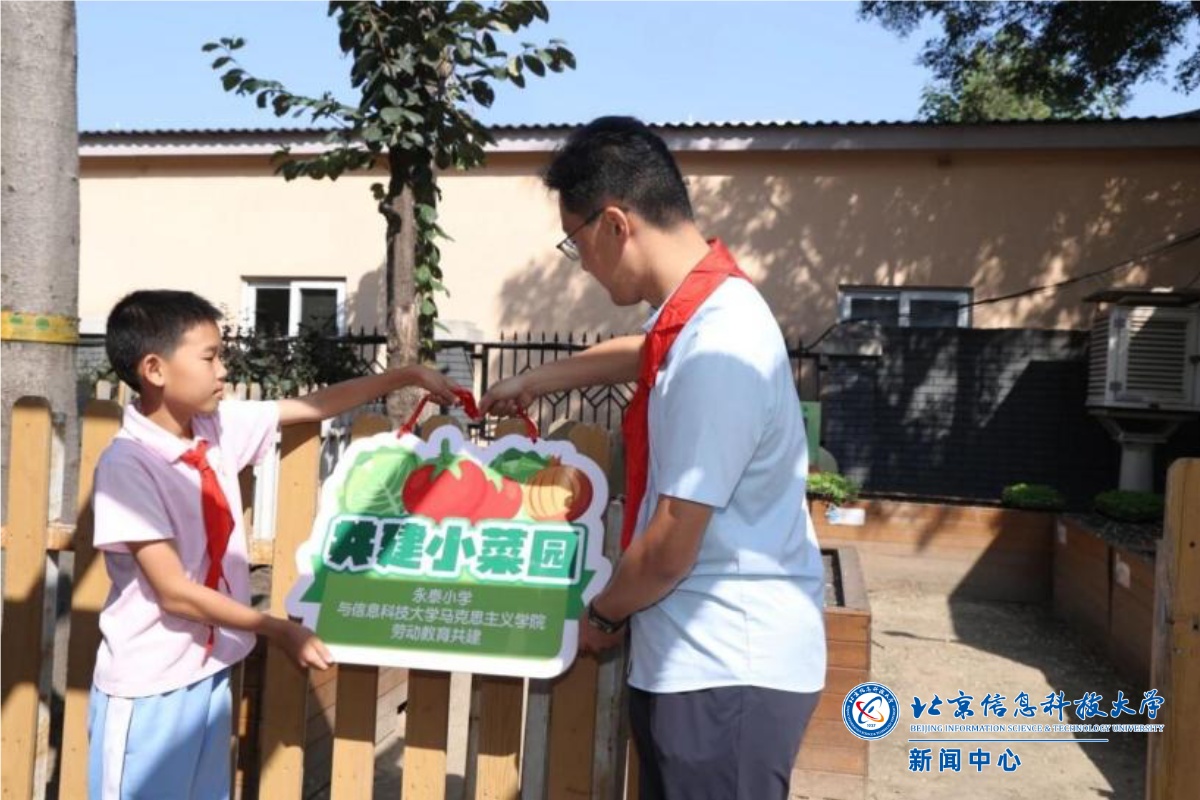 随后,永泰小学少先队员代表与张伯瀚共同为栅栏门悬挂“共建小菜园”木质标识牌。随着红绸落下,这块小小牌匾“共建小菜园”标志着双方在“大中小学思政一体化”征程上再度携手,把育人初心播撒进泥土,静待时代新人的新绿破土而出。
