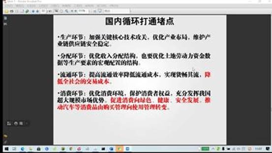 马晓飞老师首先以新发展格局的内涵为切入点,带领大家系统地学习了习近平总书记对“新发展格局”的相关论述,全面、完整、准确地理解新发展阶段、新发展理念和新发展格局,为支部成员深入讲解了对“加快构建国内大循环为主体,国内国际双循环相互促进”新发展格局重要内涵的理解。