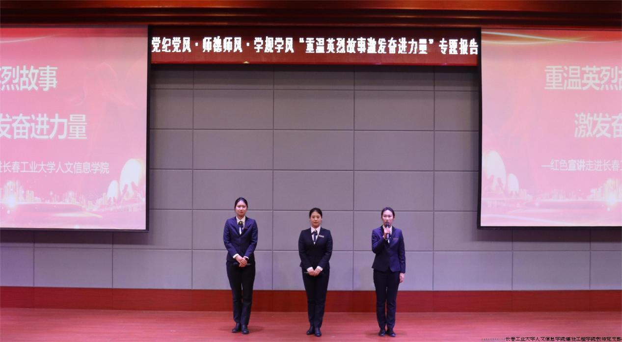 为深入学习贯彻习近平新时代中国特色社会主义思想,全面落实学校党委《关于开展党纪学习教育实施方案》相关要求,建设工程学院开展“三风化雨·浸润桃李”专题系列活动,联合长春市革命烈士陵园组织开展“重温英烈故事激发奋进力量”专题报告会,以实际行动落实立德树人根本任务。长春市革命烈士陵园管理中心副主任李忠伟、办公室主任刘婷婷、红色宣讲团讲解员李春歌、邰春宇、周韬、于微微,学生工作处处长庞旭、副处长田磊,校团委书记孟晔,建设工程学院院长孙娜、党总支书记徐辉、学习筑梦班导师胡艾筠,校青马学习筑梦班成员及建设工程学院师生代表参加本次会议。