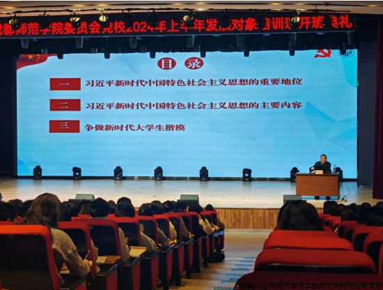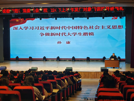 2024年3月18日晚上,成都师范学院党委副书记孙康教授在鱼凫音乐厅讲授了以“学习习近平新时代中国特色社会主义思想,争做新时代大学生楷模”为主题的专题讲座,孙康教授和2024.04批次全体发展对象参与了此次专题讲座。