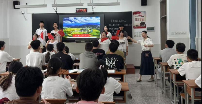 龙诗桂老师充分发挥学生主体地位,将思政基地参观学习融入到课堂教学中,班级同学以历史上四个不同阶段及其主要成就为切入点,四个小组分别选择一个主题进行学习成果的展示样。学生以歌唱、朗诵、宣讲等多种形式展示了自己对人民历史地位的理解。