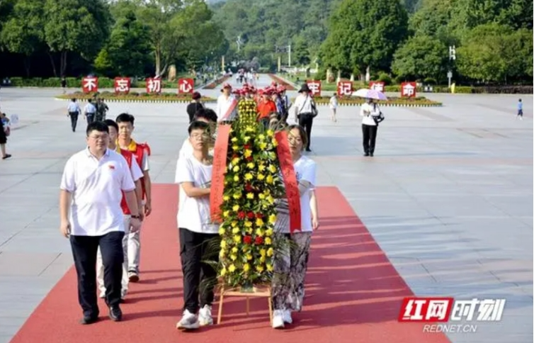 在毛泽东铜像广场,全体实践队员与服务队成员整齐列队,怀着无限敬仰之心与深切缅怀之情向毛泽东铜像敬献花篮、鞠躬致敬。带队老师刘东奇带领实践队四名预备党员高举右手,重温入党誓词。