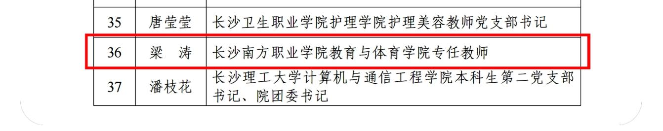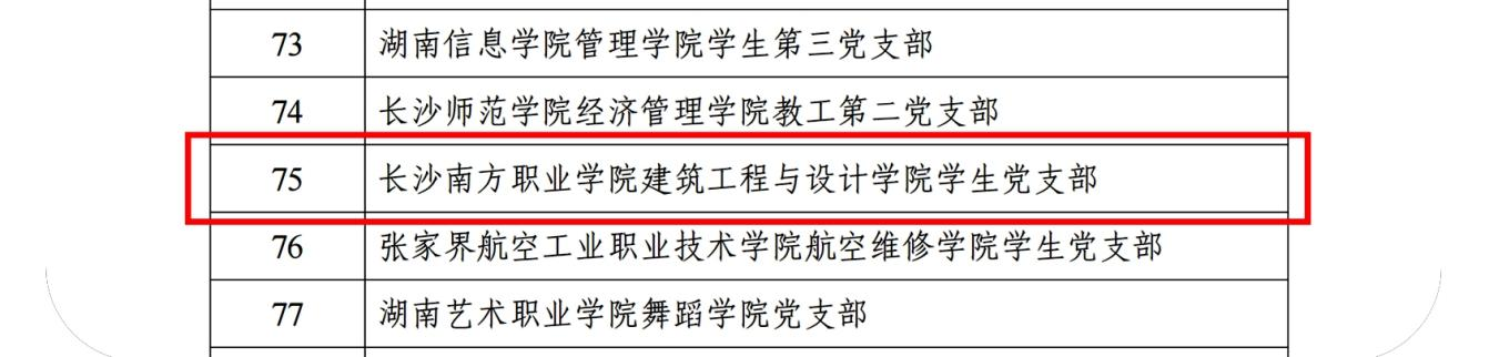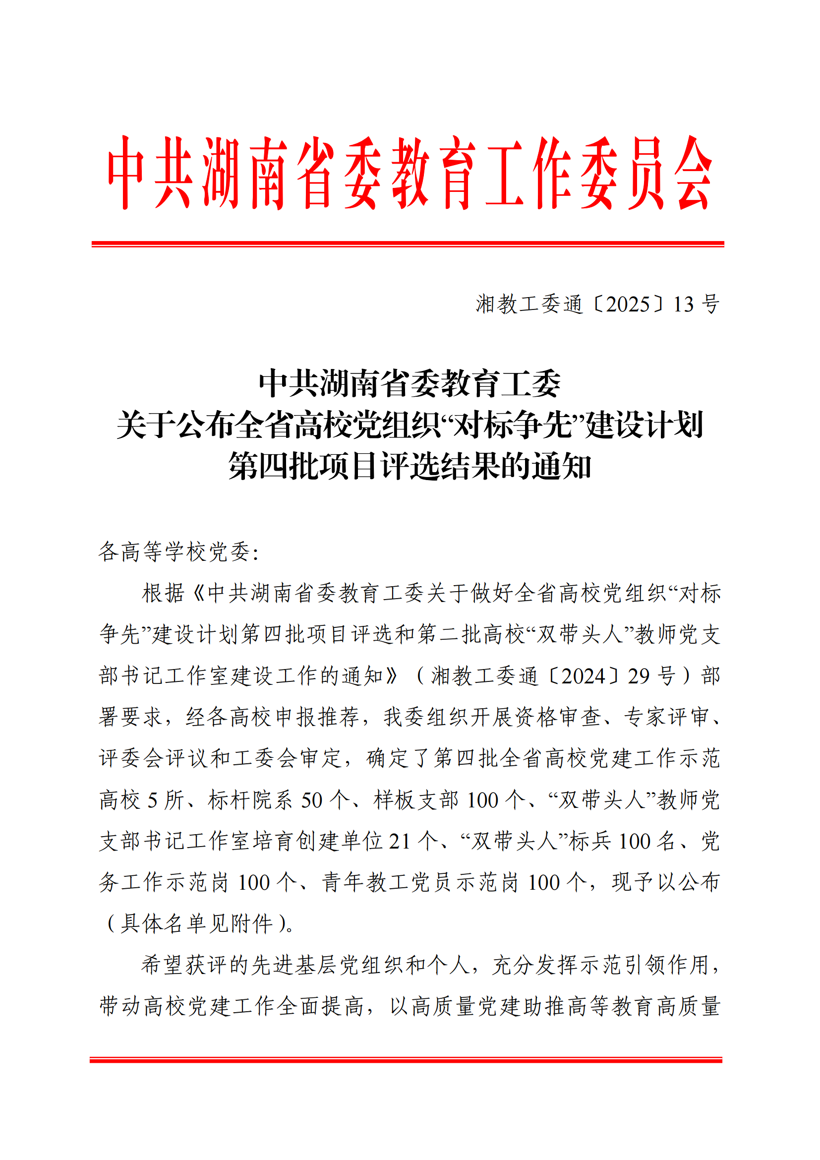 近日,中共湖南省委教育工委《关于公布全省高校党组织“对标争先”建设计划第四批项目评选结果的通知》显示:我校建筑工程与设计学院学生党支部获评“样板支部”,教育与体育学院专任教师梁涛获评“青年教工党员示范岗”称号。