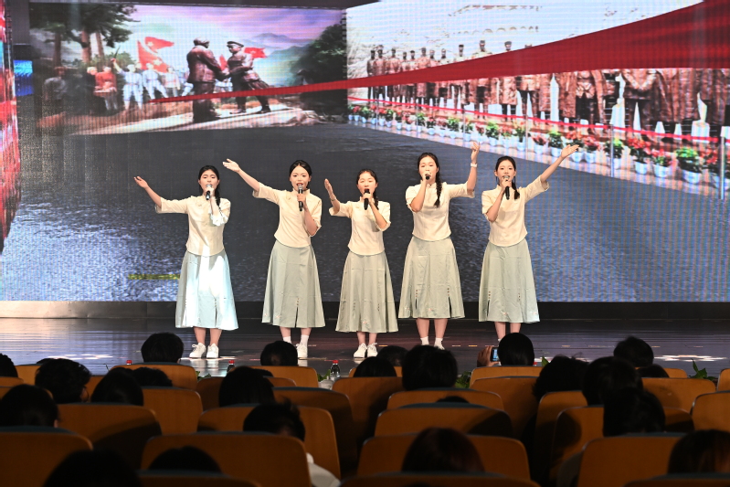 音乐思政课精心设计了“忆昔·回溯峥嵘”“笃行·薪火相传”“绽放·正当其时”三大篇章。旅游与康养学院学子融合《错位时空》《一路生花》《奉献》等7首经典曲目,穿插《如愿》三幕话剧和《致先辈》朗诵等精彩演绎。武进区南宅实验学校25名小学生合唱《祖国有我》。武进区淹城初级中学学生深情演绎朗诵《月光下的中国》。常州市北郊高级中学与旅游与康养学院学子联袂献唱《唱支山歌给党听》。音乐思政课通过经典音乐与情景演绎的有机结合,全景展现了中国青年在不同历史时期的奋斗图景:从百年前青年觉醒者为民族命运呐喊的场景,到革命年代青年投身工农运动的热血故事,再到新时期青年在各领域开拓创新的担当。