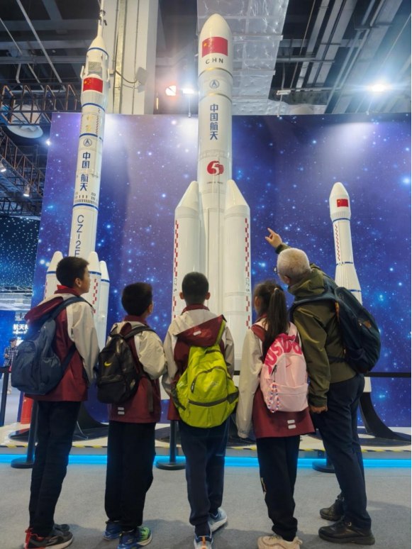 在航天科普展上,从神舟飞船的模型,到嫦娥五号、嫦娥六号采集的月球土壤样品,从北斗卫星组网到天宫空间站VR体验,师生们通过智能导览设备和互动式展板,近距离触摸大国重器背后的科技密码,也直观感受到了中国航天事业的伟大成就。