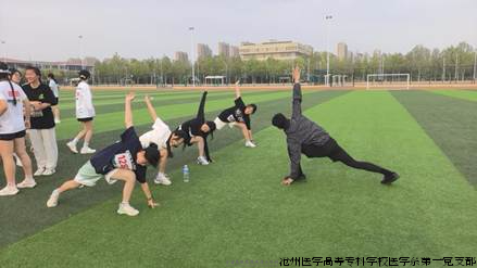 医大临床24-1班张佳李豪同学带着女子组4✕400接力的同学做热身运动