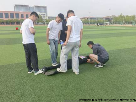 医大临床24-1班的同学们为跑完5000米的张佳李豪做放松按摩
