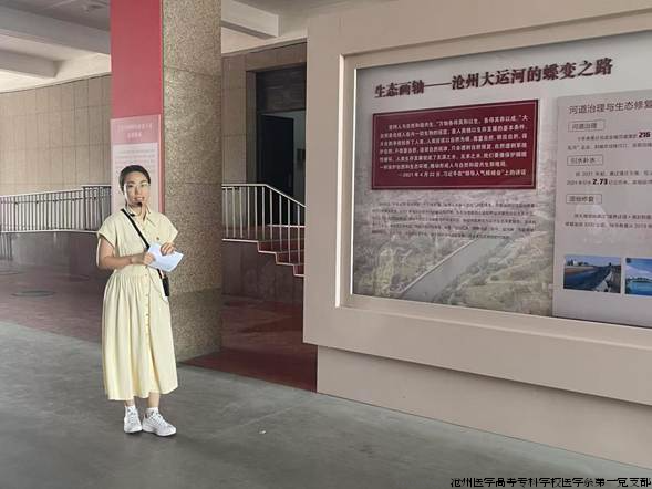 在新落成的党建思政文化长廊展区,马克思主义学院段湘君老师担任讲解员,以十四块主题展牌为脉络,全景式呈现学校大思政教育成果。展览坚持以“加强党的全面领导”为核心,紧密追随习近平总书记关心关爱沧州的足迹,将发生在沧州大地上的“盐碱地的故事”“黄骅港的故事”“大运河的故事”“红色基因的故事”以及学校“大爱沧医的故事”巧妙串联。