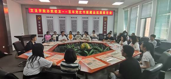 文法学院1996级校友、全国雷锋专题藏友联谊会会员、辽宁省集报协会副秘书长孙凯受邀为文法学院师生做百年党史书报展览讲解,文法学院党委书记隋永强,党委宣传部副部长李晨,文法学院党委副书记、副院长(兼)夏风云,文法学院副院长李丹及文法学院师生参加巡展宣讲。