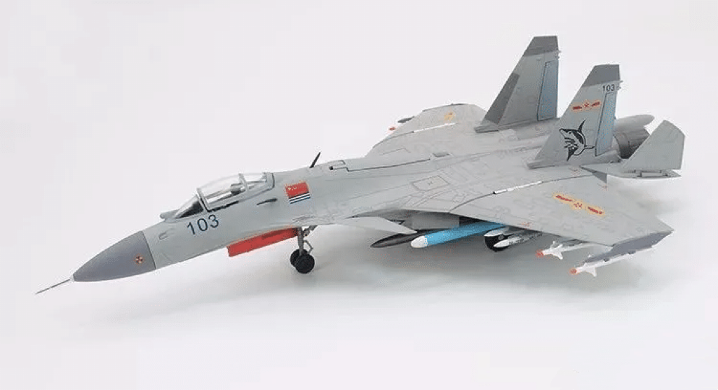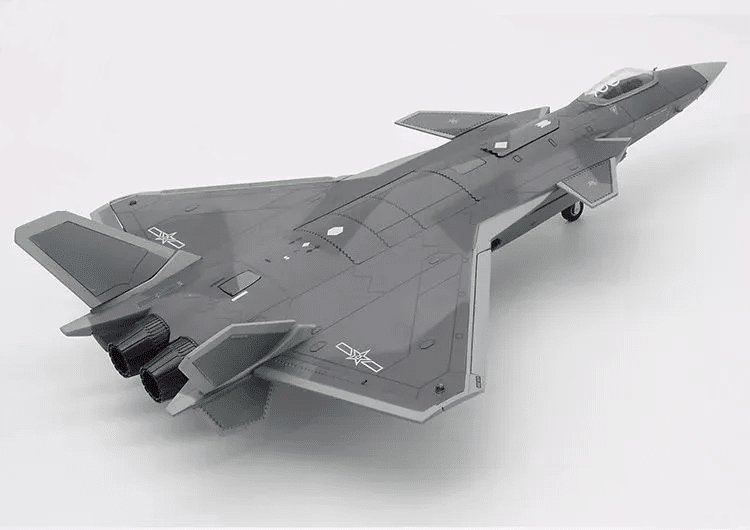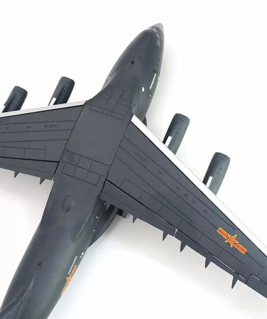 左上图为歼-15战机模型,左下图为歼-20战机模型,右中为运-20战略运输机模型