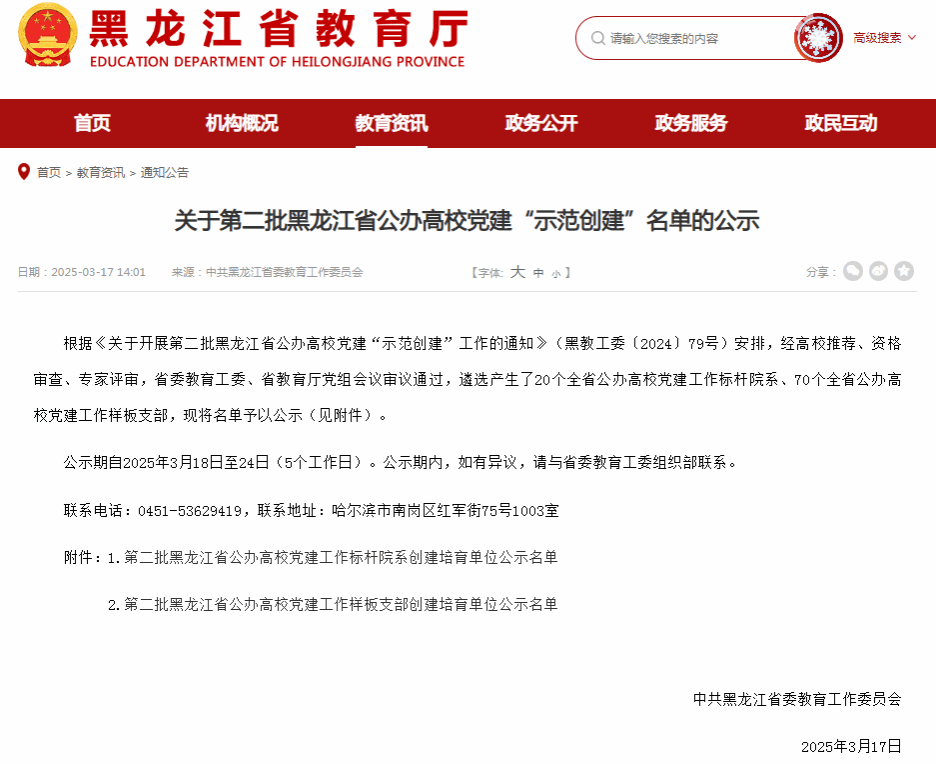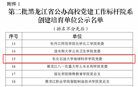 2025年3月,黑龙江省委教育工委公示了第二批黑龙江省公办高校党建“示范创建”名单,东北石油大学地球科学学院党委获批黑龙江省公办高校党建工作“标杆院系”创建培育单位。