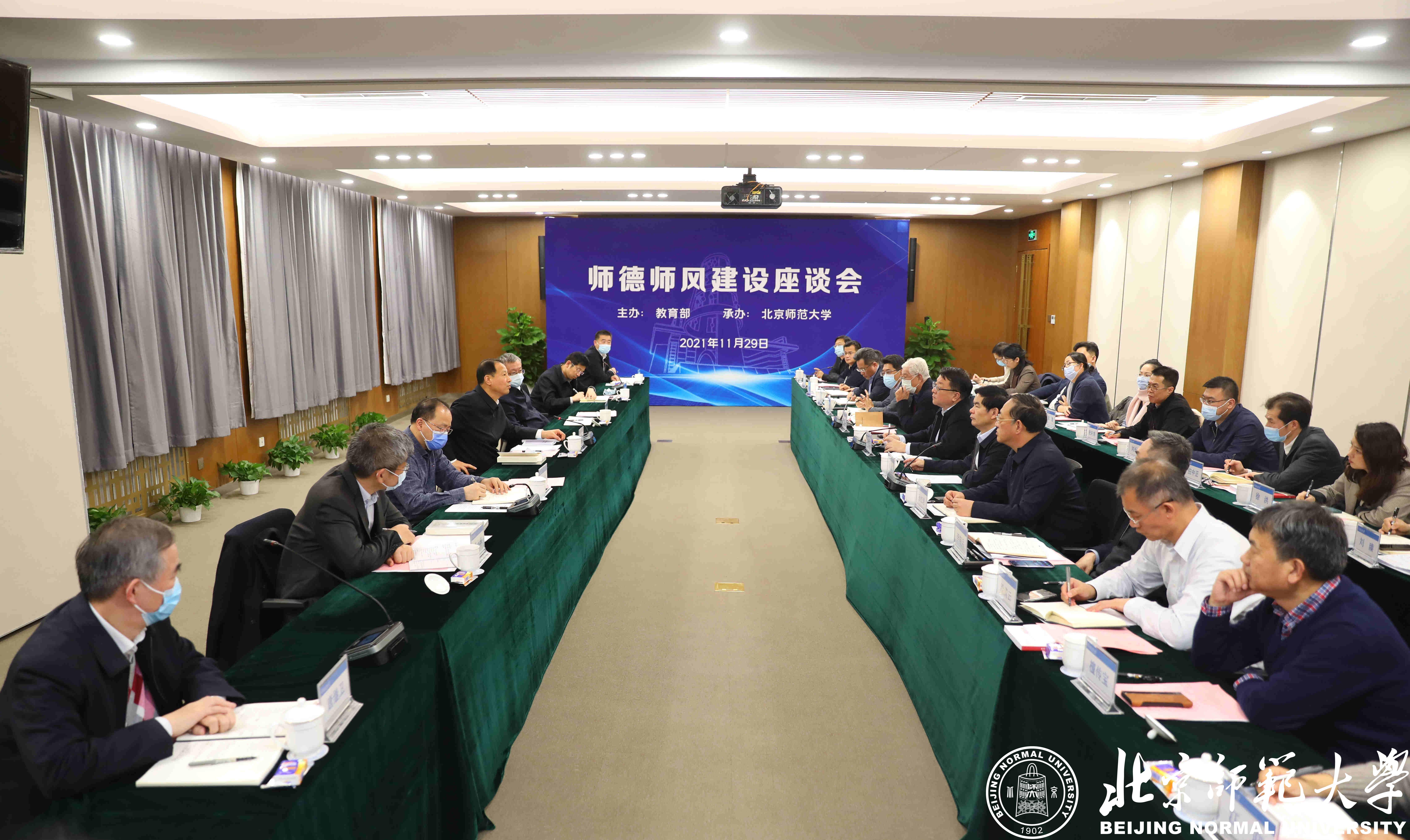 11月29日,教育部师德师风建设座谈会在北京师范大学举行。会议的主题是,深入学习贯彻习近平总书记关于教育的重要论述和教师队伍建设的重要指示精神,聚焦中央巡视反馈高校师德师风问题,深化问题整改落实工作,专题研究高校师德师风建设工作。教育部党组成员、副部长孙尧出席会议并发表讲话。教育部教师工作司司长任友群、巡视工作办公室主任何光彩、人事司副司长王磊、教师工作司副司长黄小华、思想政治工作司副司长李景升、学位管理与研究生教育司二级巡视员唐继卫等相关司局负责同志出席座谈会。北京师范大学党委书记程建平、校长董奇及全部在校的学校领导班子成员,全国师德师风建设专家委员会总顾问、北师大资深教授顾明远,教育学部、中国教育与社会发展研究院、化学学院、哲学学院、政府管理学院等单位专家和教师代表,学校党委办公室、组织部、宣传部、纪检监察办公室、教师工作部、巡视办公室、科研院、教务部、人才人事处等职能部门负责人参加座谈会。全国师德师风建设专家委员会总顾问、北师大资深教授林崇德提供了书面发言材料。会议由程建平主持。