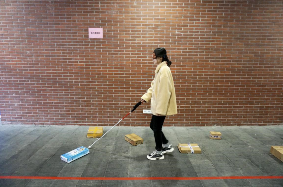 在盲人体验区中,黄斑病变、视力极度低下眼镜让在场同学看到了“不一样”的世界。盲人扑克牌、盲人乒乓球等供盲人、聋哑人娱乐的辅具也让在场同学惊叹不已。体验者还会戴上眼罩,使用导盲杖来规避障碍物,小心翼翼地摸索前进,体会在黑暗世界中前行的感觉,引发了对视障群体的强烈共情。