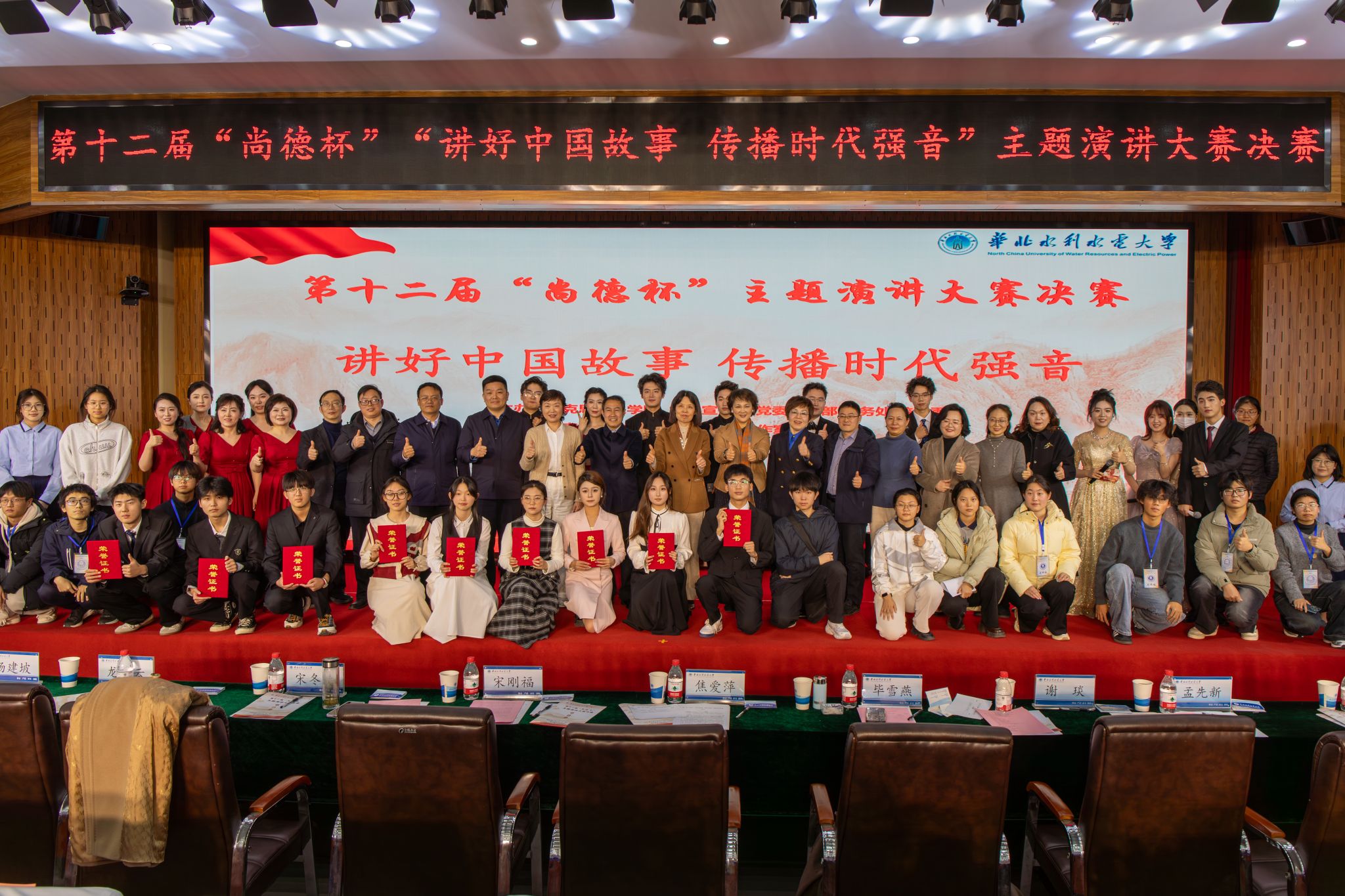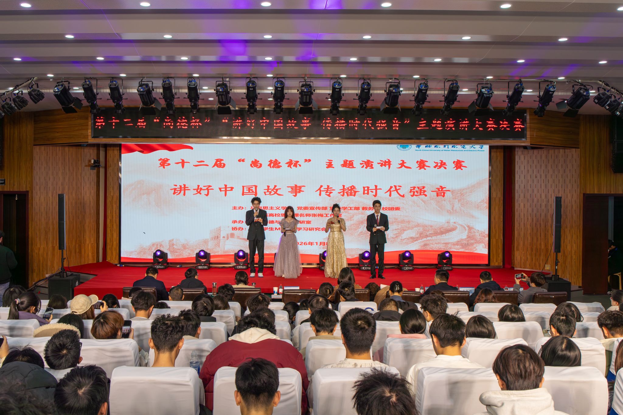 焦爱萍在开幕致辞中指出,新时代的中国正以昂扬的姿态屹立于世界东方,无数振奋人心的故事在神州大地上不断涌现,“讲好中国故事”,是时代赋予青年的光荣使命,更是青年成长路上的必修课。“尚德杯”自创办以来,始终坚守立德树人初心,成为锤炼学生品德修为、传播党的创新理论、弘扬华水精神的重要平台,是我校校园文化的一张闪亮名片。她希望新时代青年学子要以此次大赛为契机,将个人理想融入国家发展大局,在演讲中感悟思想伟力,在实践中践行初心使命,展现华水学子爱国奉献、担当作为的精神风貌。